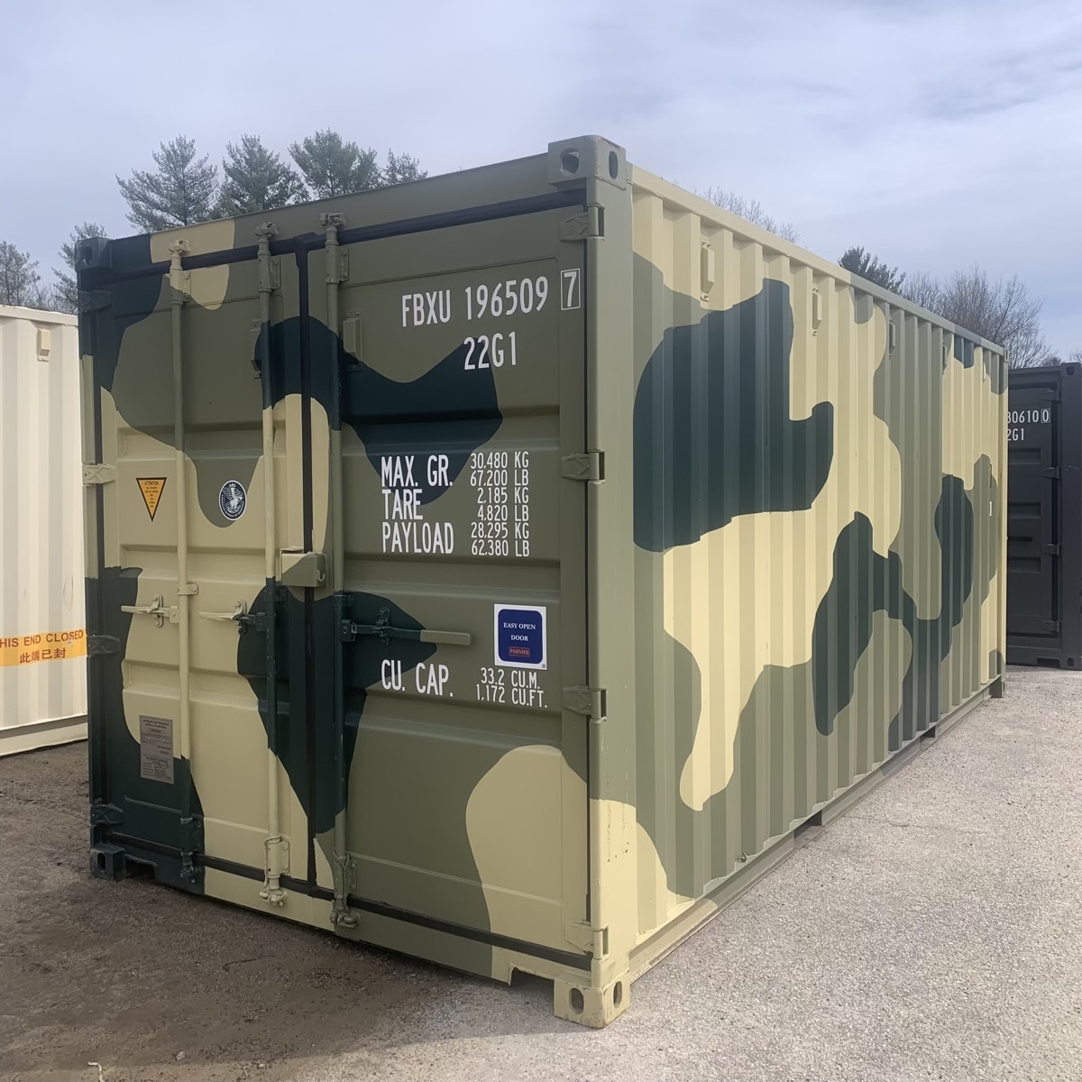 New (one-trip) 20′ container. These containers are overseas, loaded with product, shipped to North America, and unloaded, so they are essentially new, save for the single trip they made over the ocean with product inside.